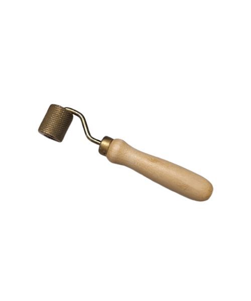 Ένα εργαλείο για την τοποθέτηση μονωτικών υλικών με ξύλινη λαβή και μεταλλικό κύλινδρο.