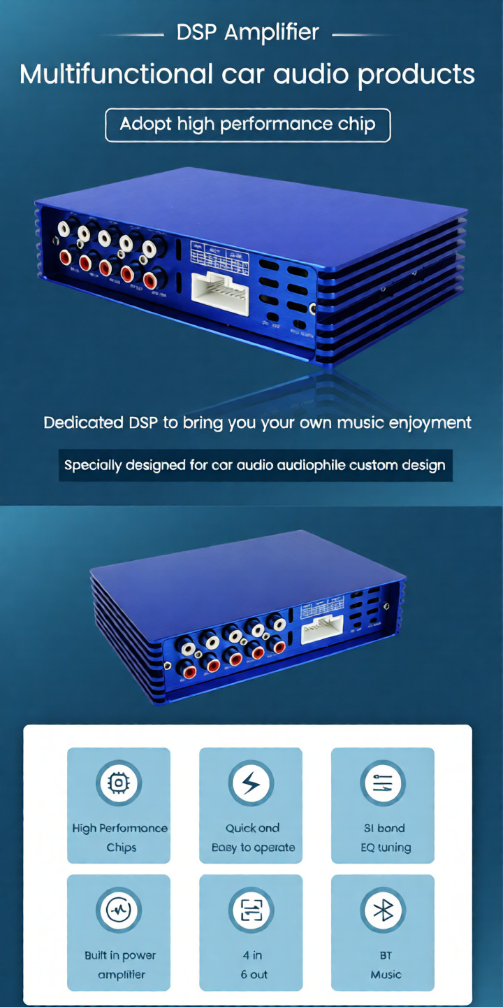 - Optional use as DSP processing unit only (requires separate external amplification): 4 RCA Inputs (2 Front + 2 Rear) / 6 RCA Outputs (2 Front + 2 Rear + Center + Sub)
