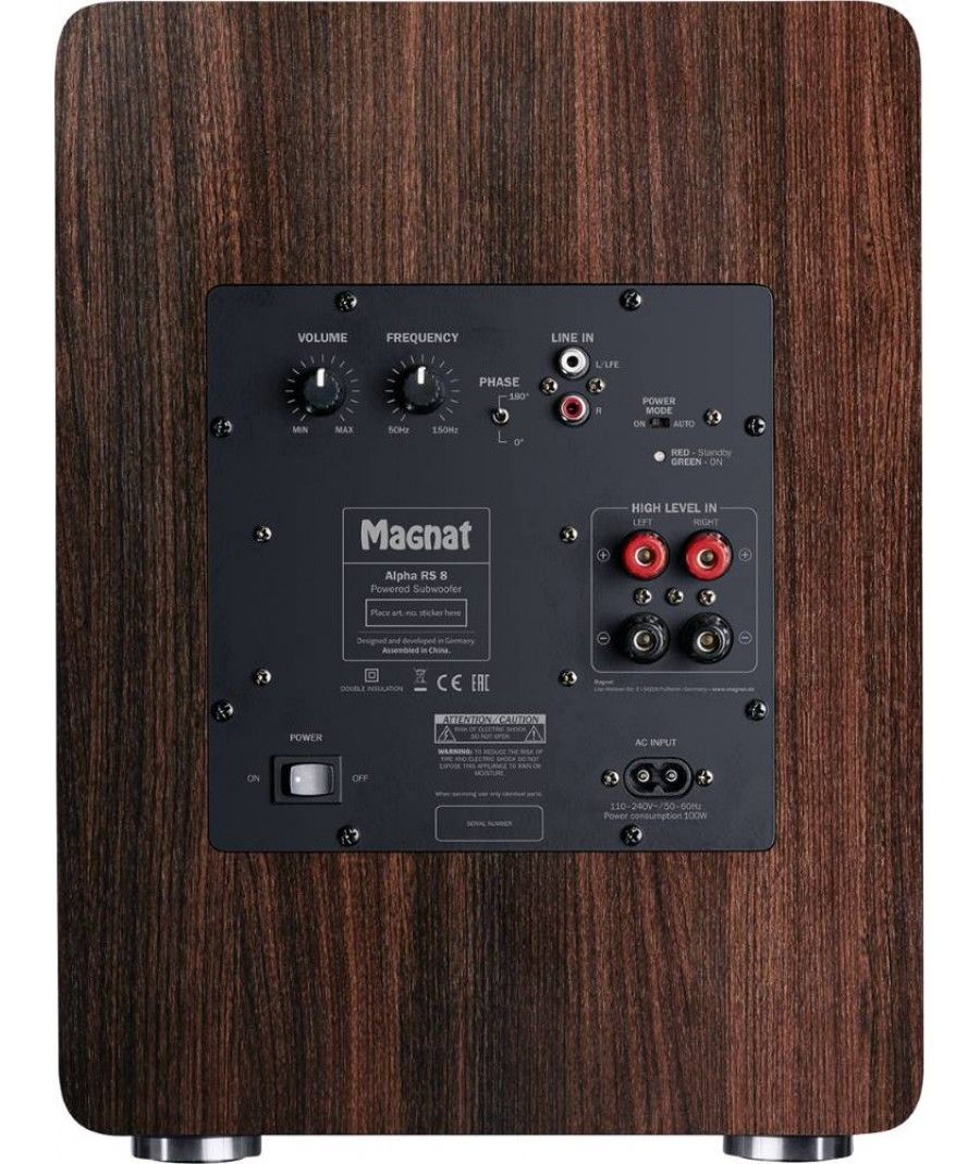 Το Magnat Alpha RS 8 διαθέτει woofer 200 mm (8 ιντσών) μεγάλης ισχύος μεγάλης απόστασης σε περίβλημα με bass reflex, εξοπλισμένο με δύο θύρες Airflex. Ο ενσωματωμένος ενισχυτής Class D αποδίδει συνεχή ισχύ 80 watt, ενώ η μέγιστη ισχύς είναι εντυπωσιακά 160 watt. Η τεχνολογία που ενσωματώνεται στο RS8 του επιτρέπει να αναπαράγει συχνότητες έως 25 Hz. Τα ηλεκτρονικά του ενισχυτή επιτρέπουν τη ρύθμιση της έντασης, της συχνότητας και της φάσης διασταύρωσης, επιτρέποντας έτσι τη βέλτιστη προσαρμογή στην ακουστική του δωματίου.